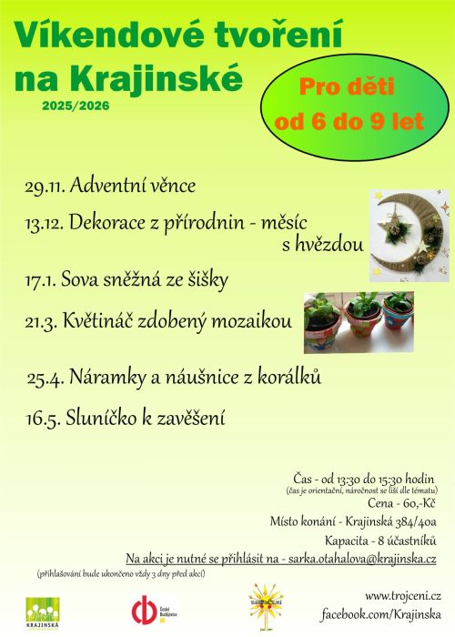 Kapacita jednotlivých tvořivých setkání je omezena na 8 účastníků a je nutné se přihlásit předem prostřednictvím e-mailu na adresu: sarka.otahalova@krajinska.cz.
